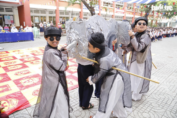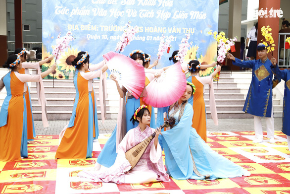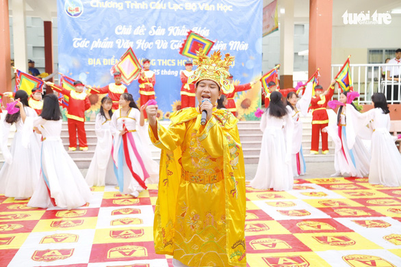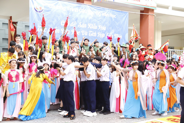 Tùy vào chương trình môn văn của từng khối lớp, học sinh sẽ chọn hình thức thể hiện khác nhau về một tác phẩm mà các em yêu thích. Học sinh lớp 6 biểu diễn hoạt cảnh Thầy bói xem voi. Học sinh lớp 7 múa và hát bài Bánh trôi nước.