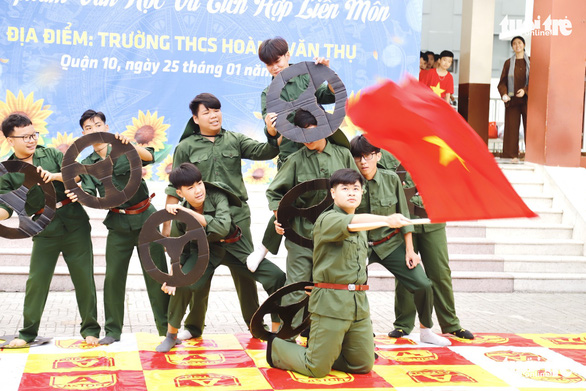 Cô Nguyễn Thị Phương Linh – tổ trưởng tổ văn Trường THCS Hoàng Văn Thụ – cho biết: “Đây là năm thứ 4 chúng tôi tổ chức cho học sinh học văn bằng hình thức sân khấu hóa tác phẩm. Để học tập theo hình thức này, học sinh phải chủ động tìm hiểu bài, đóng vai, làm việc nhóm, liên hệ kiến thức của môn ngữ văn với môn Lịch sử, Âm nhạc, Địa lý,…”.